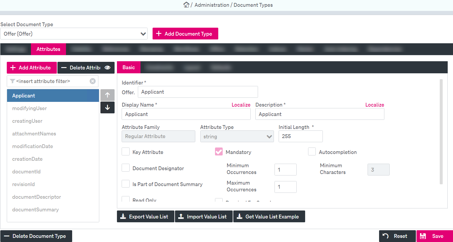Click the Attributes tab and add an attribute “Applicant” that will be used for connection with the attribute “CustomerID” from master document type. This new attribute must be of the same type as “CustomerID” and also “single-value”.