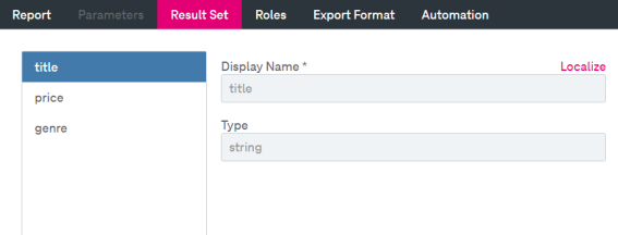 The Results Set tab allows localization of the elements which are included as results of a report query. The list of these elements is filled based on the query definition.
