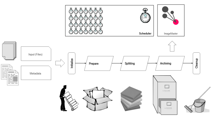 The Scheduler manages the overall processes with their chronological executions and it triggers single batch processes. In the preparation stage the supplied data is parsed and transformed into a format with a structure that is suited for import into ImageMaster. These processing steps must always be customized to satisfy individual project requirements.