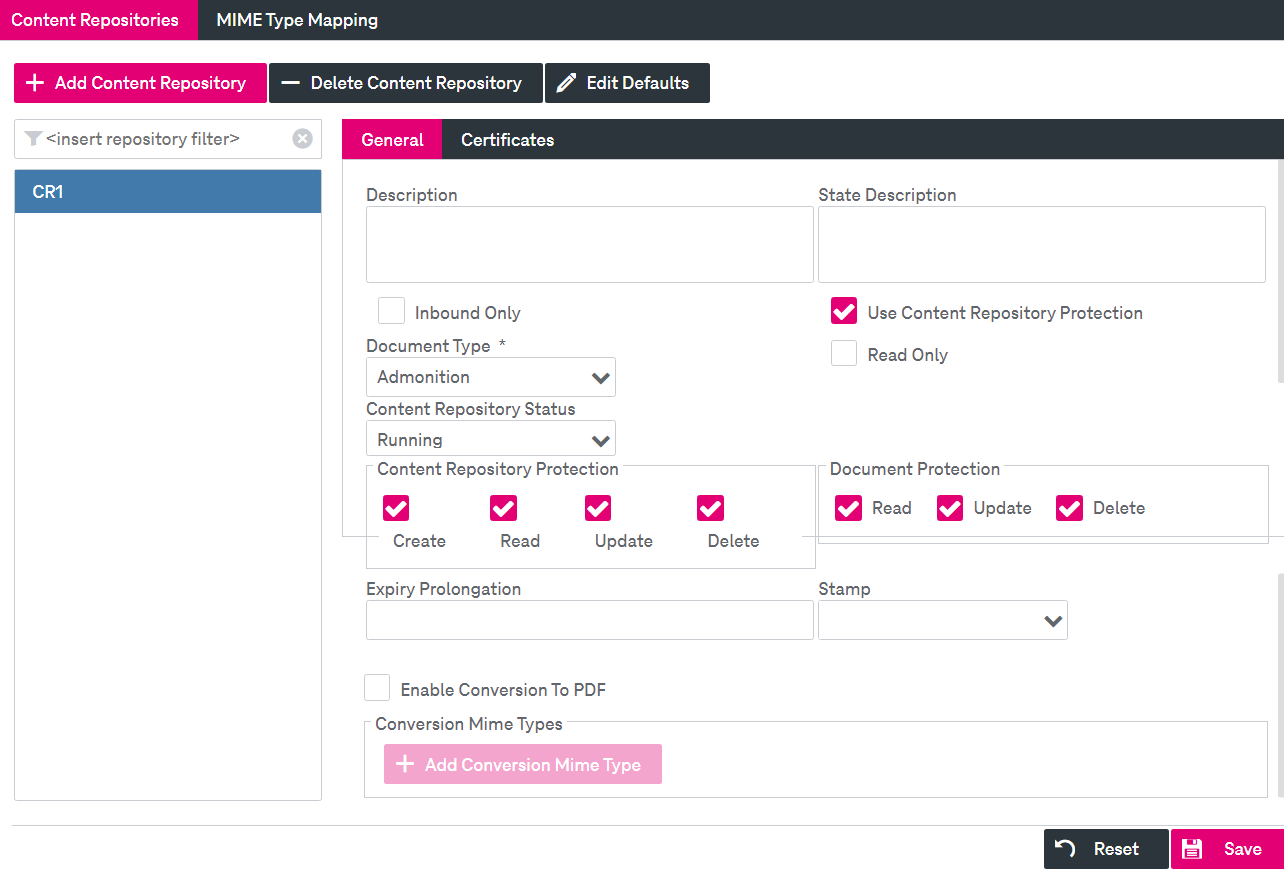 Several SAP content repositories may be reflected within one ImageMaster content repository, where each SAP content repository must be characterized by a unique repository name. Each content repository allows for its own status and protection configuration (see the corresponding parameters below). In certain scenarios it may make sense to use separate repositories with different access and document protection settings. Available content repositories are listed alphabetically in the content repositories list (general ImageMaster filtering functionality is available).