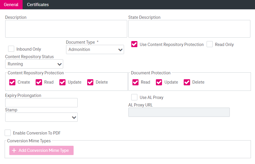 Select one of the options: “Running” or “Stopped”. In status “Stopped” the content server denies service requests for this particular content repository by a corresponding error message. |