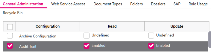 To allow the user to also configure audit trail rules in the administration view, set the Update permission to “Enabled”. The Audit tab in the System room will then be available for update operations. Also see the next section for details.