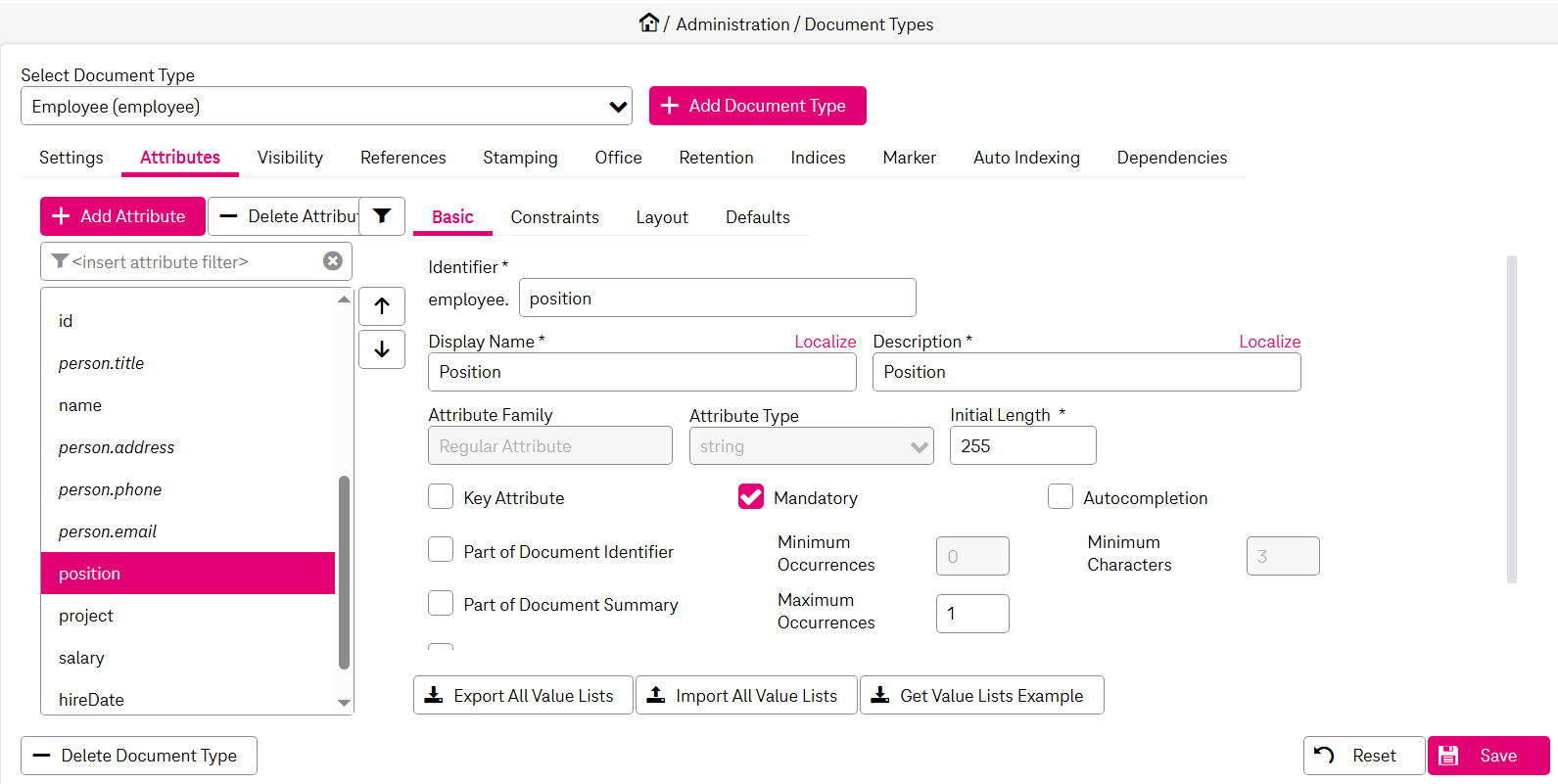 You can add an arbitrary number of attributes to each document type. These attributes define metadata of a document and appear as fields in dialogs of the WorkplaceClient. Attributes are constrained by an input type to restrict a value to a certain range, e.g. text, decimal or date.
