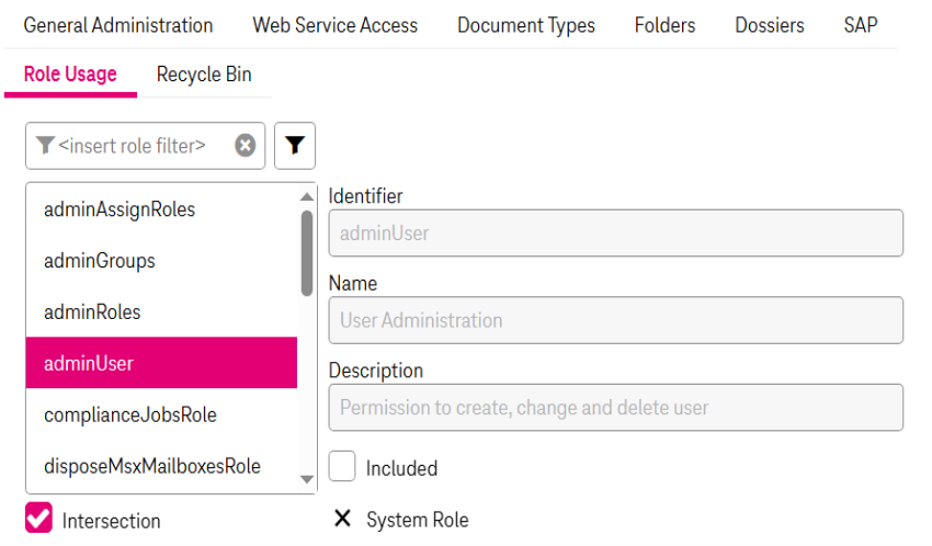 In case of an intersection, only those permissions are enabled which are explicitly enabled for all underlying roles. This corresponds to the examples above for Invoice / Read / Intersect and for Payroll / Read / Intersect (R) (U). If there is one undefined permission, this already disables the overall permission.