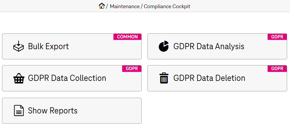 The compliance cockpit is a maintenance room that provides functionality for the following options: