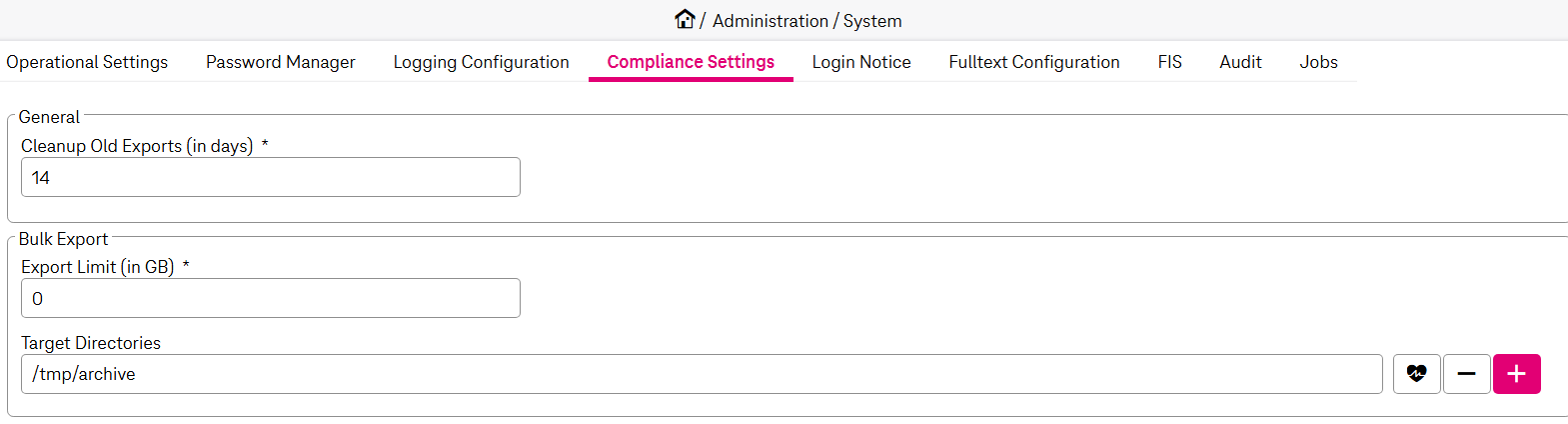 Specify Target Directories where the bulk exports are stored. You can add several directories by clicking the “plus” icon. If more than one directory is specified, the user can choose the preferred directory on bulk export creation.