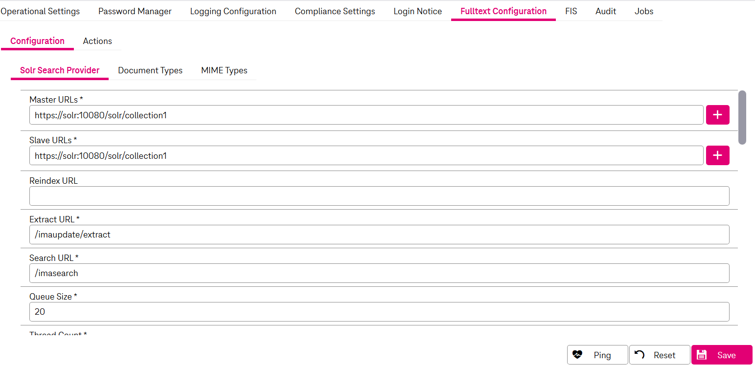 The fulltext configuration view provides access to the basic configuration settings for the fulltext indexing process, which is based on the fulltext server Solr.