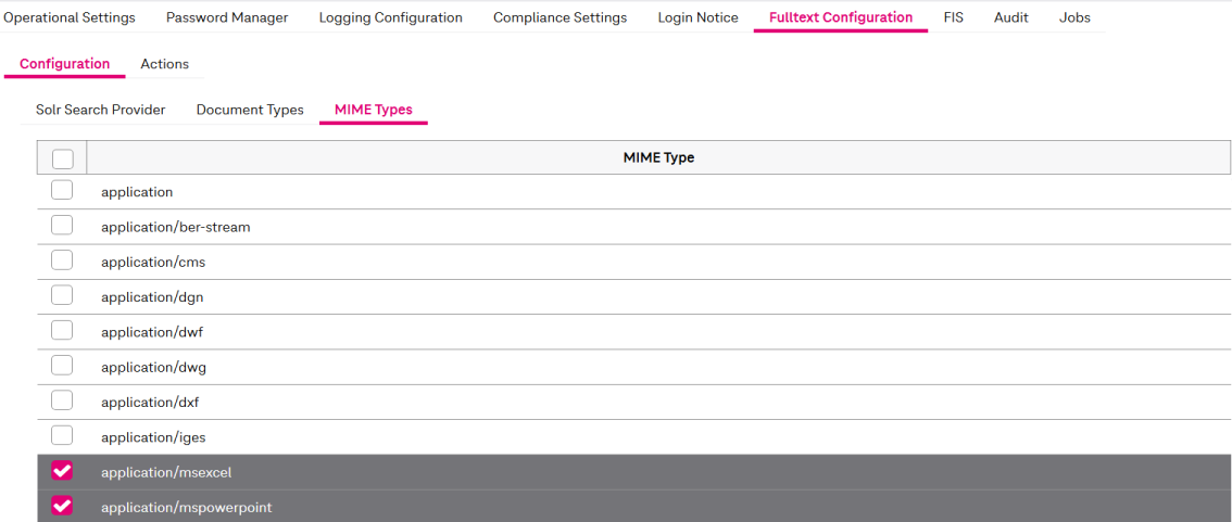 Select or clear the check boxes to enable the MIME types to be used. Only document attachments with an enabled MIME type will be indexed for fulltext.