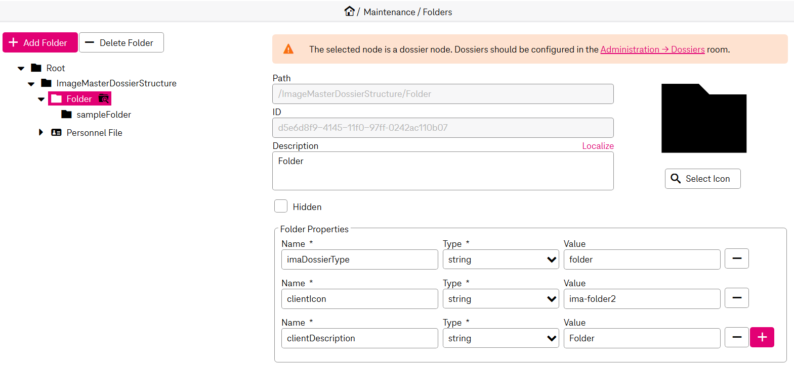 The Folders maintenance room allows users to manage the hierarchical structure of folders used within the system. This interface provides tools to create, edit, and delete folders, ensuring organized storage and streamlined navigation. Each folder can be configured with specific properties, including a name, type, and optional metadata, enabling customization.