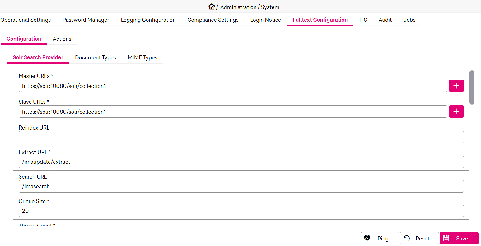 The System > Fulltext Configuration tab allows you to configure fulltext settings and to manage maintenance tasks. The administrator configures settings and specifies the types of documents to be indexed. When an indexing process is run (either automatically or manually via the Actions tab), the related documents become available for full-text search.