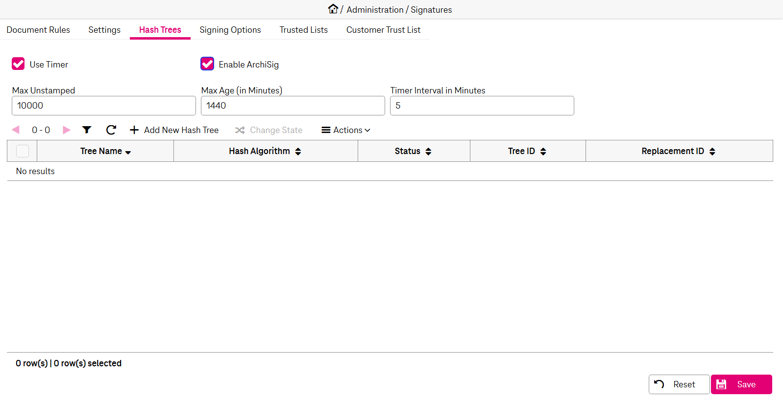 The Hash Trees tab allows the configuration of the ArchiSig Module. The ArchiSig Module includes all functions that serve the long-term cryptographic securing and preservation of authenticity and verifiability of content.
