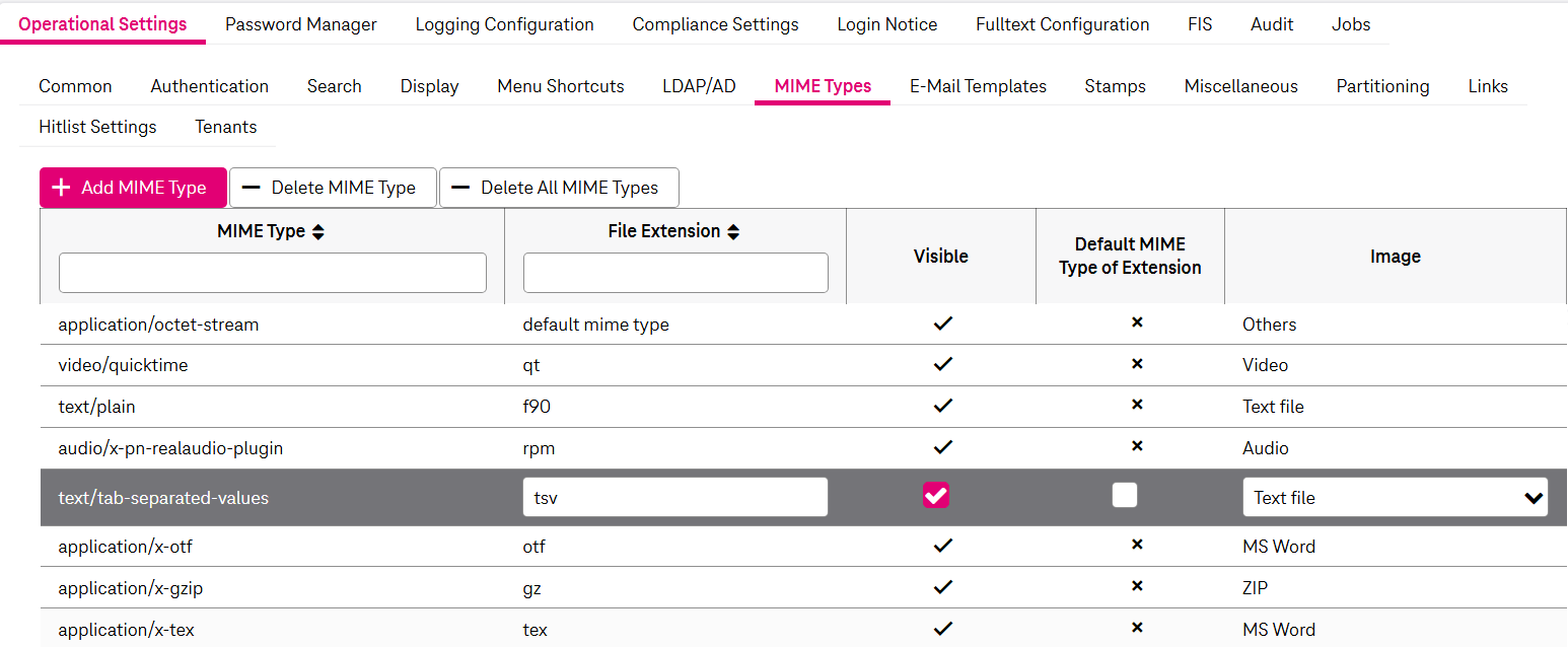 Click the Operational Settings > MIME Types tab to configure available MIME types with associated file extensions. The screenshot contains a mapping table of all MIME types with their assigned file extensions.