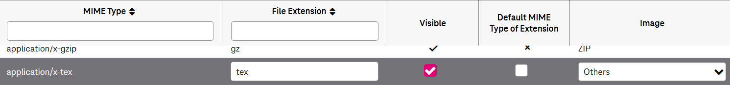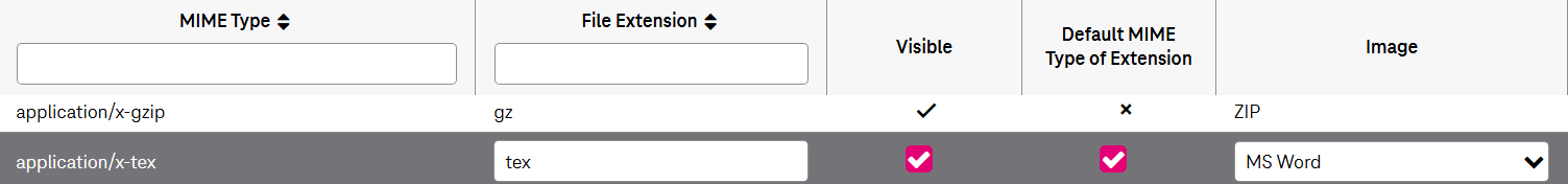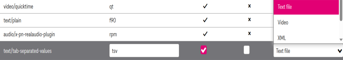 If the list is sorted by file extensions, the entries belonging to one MIME type can be located in different, non-consecutive positions in the list. Sort entries in the list by clicking on the column heading “MIME Type” to better see all file extensions that are associated with the same MIME type.
