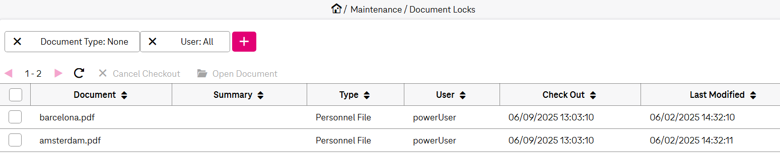 To view locks, expand the panel Maintenance in the sliding navigation menu and click Document Locks .