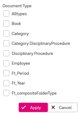 Document Type: Select the box to restrict the hit list to the specific document type. Select document types in the appeared menu and click Apply.