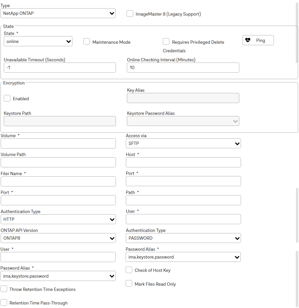 Defines the actual archive type to be used in the NetApp configuration For properties of this archive refer to the respective archive types. NOTE: If you select access via FTP or SFTP, do not activate the option “Mark Files Read Only”! |