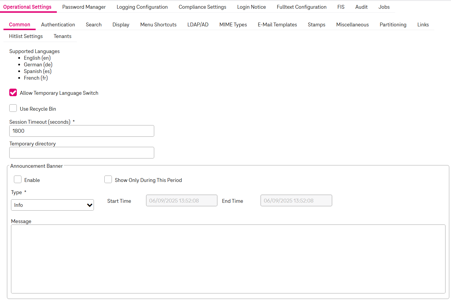 The Operational Settings tab includes a set of subtabs, where you can define parameters.