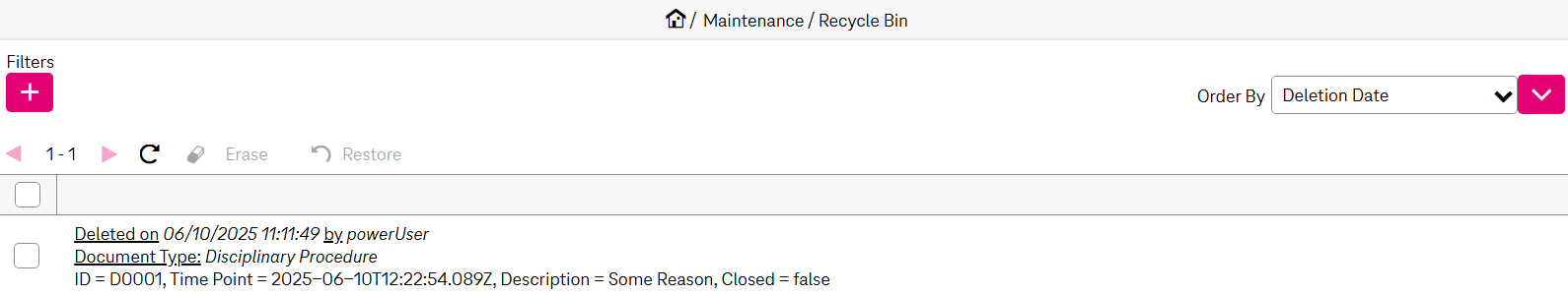 To view deleted documents, expand the panel Maintenance in the sliding navigation menu and select Recycle Bin. When you access the recycle bin view, you must first refresh the view to see any entries.
