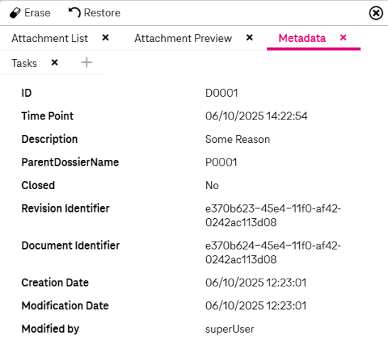The view is similar to the standard document preview, and it offers two specific functions: erase and restore. If a document has attachments, they are displayed in the same way as in the standard document preview.
