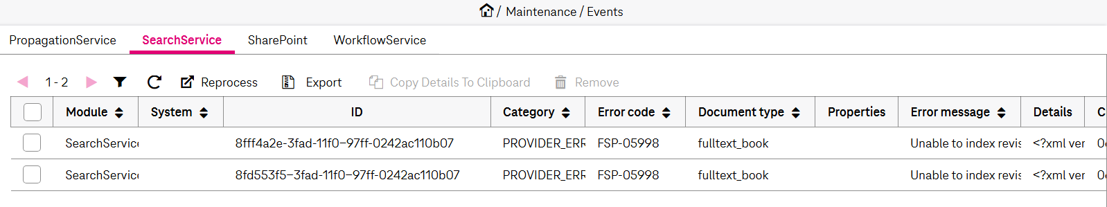Figure 247: Maintenance – events: reprocessing events