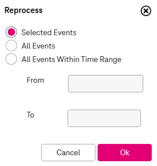 All Events Within Time Range: Use the From and To fields to specify a time range for events to be reprocessed.