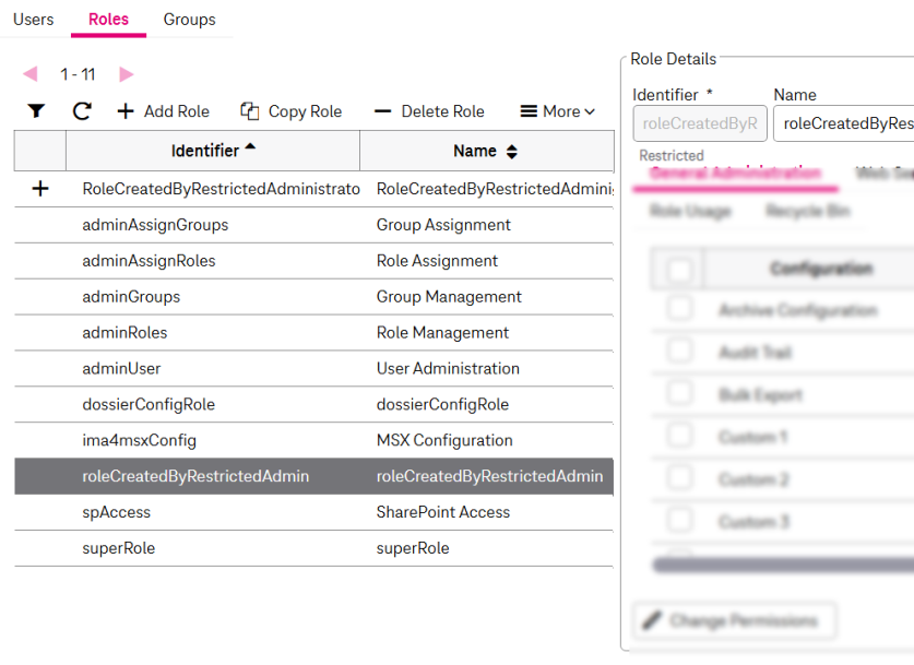 In the example above you can see that the permission “Role Configuration” is enabled for the role “Role Management”. It does not make sense to grant both of these permissions (Role Configuration + Restricted Role Configuration) to the same role. The intention is to be able to grant restricted access via the restricted role to a restricted user administrator.