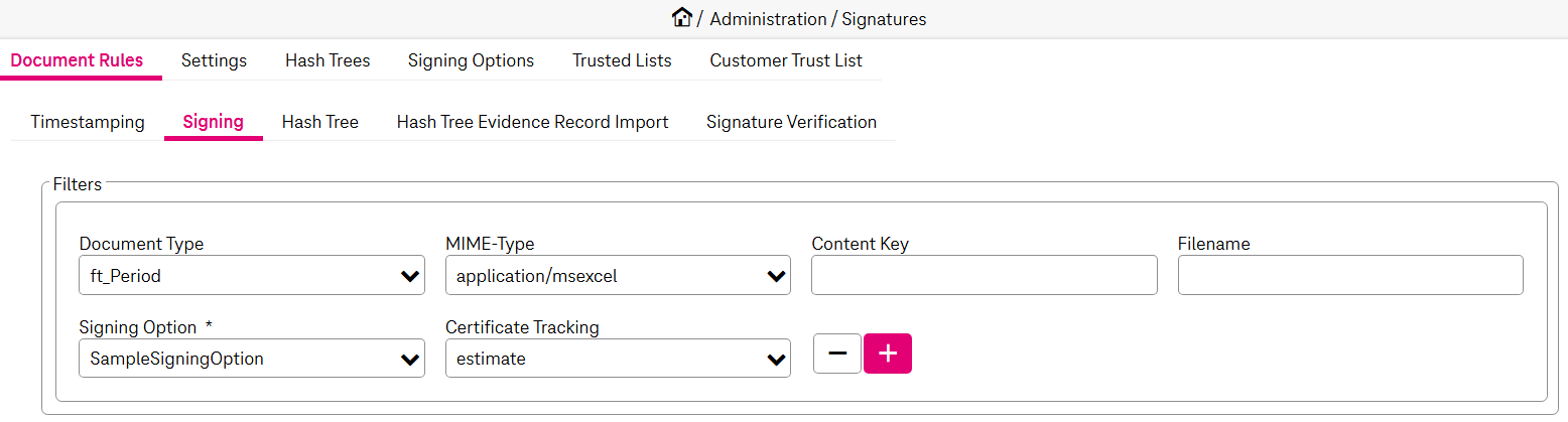 Each content object, which is stored in ImageMaster and passes configurable filters, will be signed. Open the Signature tab and expand the panel Signing to configure the filters.