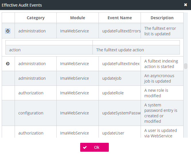 To validate the current audit trail configuration (including the changes that have not been saved), click the Effective Events button located in the top-right corner of the screen, see figure System – audit . The Effective Audit Events window opens. The list of events includes all events that will finally appear in the audit trail according to your current configuration of enabled rules.
