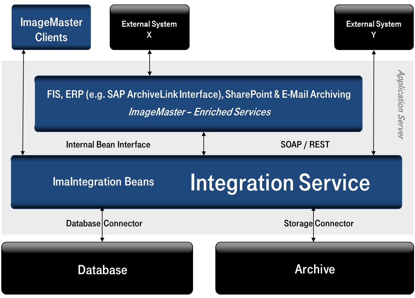 Further ImageMaster web services, which are out of scope of this documentation, the so called “enriched services”, such as FIS for batch import and export or the services for ERP Archiving, ERP Messaging and ERP Information Lifecycle Management (e.g. based on SAP/ArchiveLink or SAP/ILM integration) rely on this API. Some enriched services may additionally use the internal system interface (ImaIntegration Beans), which is not part of this documentation. Within the Integration Service a conceptual distinction can be drawn between system management services or basic document management services.